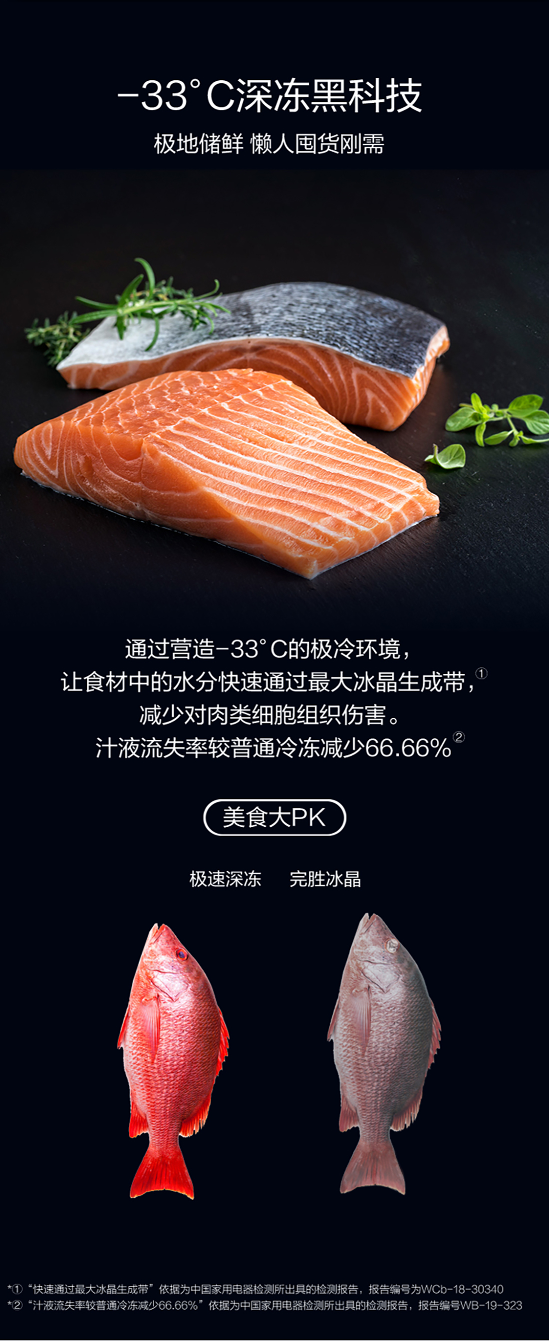 搭载-33℃深冻锁鲜科技,肉汁饱满更长久。采用离子长效抗菌净味,抗菌率高达99.9%。风冷无霜,拒绝风干,食材水润新鲜。