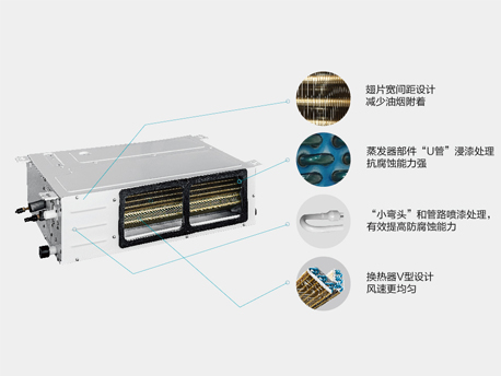 厨享内机采用金色防腐翅片换热器,抗腐蚀能力强,翅片采用宽间距设计,可减少油烟附着:换热器采用V型设计,使风速更均匀。 |