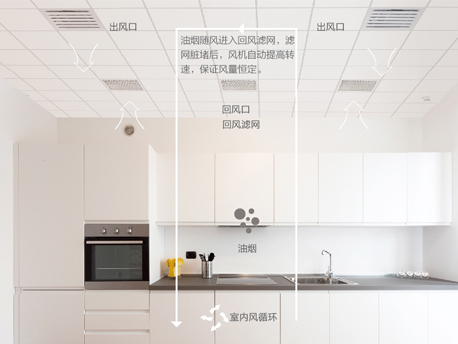 机组可智能检测风口油烟脏堵程度,并自动匹配风机转速,保证风量恒定,舒适不衰减。 |