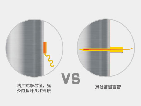 采用贴片式感温包贴在水箱内胆上,可减少内胆体开孔和焊接,杜绝感温盲管泄漏的隐患,水箱更可靠耐用