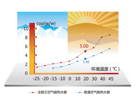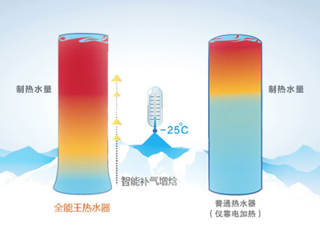 采用低温智能增焓系统,具有双重动力,可在-25℃至45℃宽工况条件下制取热水 |